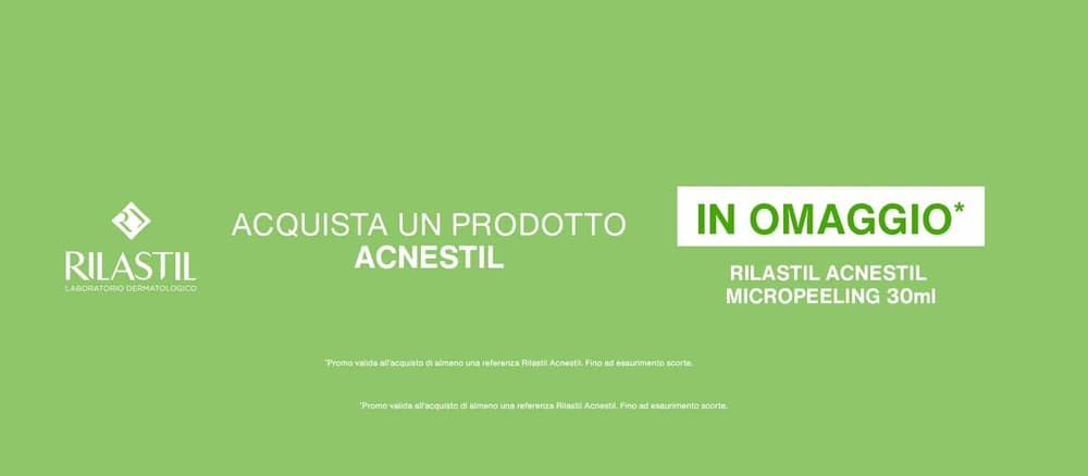 Con l'acquisto di almeno un prodotto della linea Acnestil (detergenti, creme o trattamenti intensivi), riceverai il Micropeeling Acnestil da 30ml in omaggio.