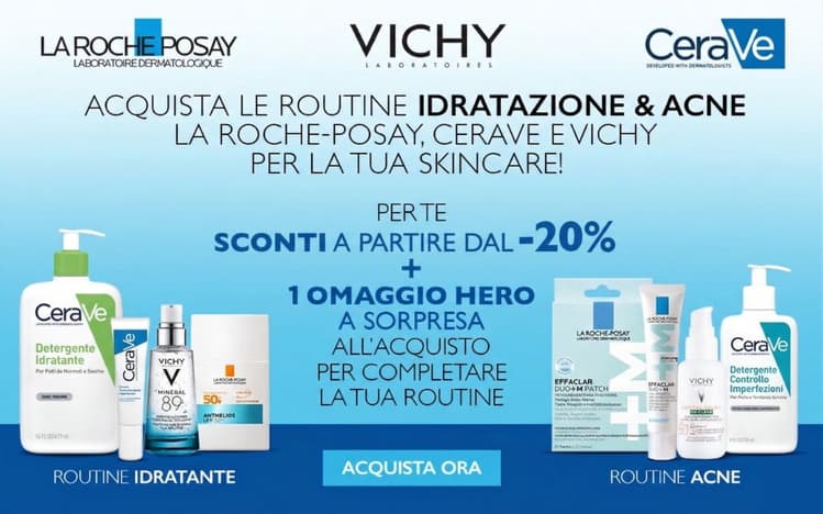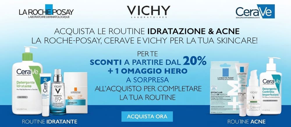 Sconti fino al -20% su una vasta selezione di prodotti La Roche-Posay, CeraVe e Vichy. 1 OMAGGIO HERO a sorpresa incluso nel tuo ordine per completare la tua routine ideale.