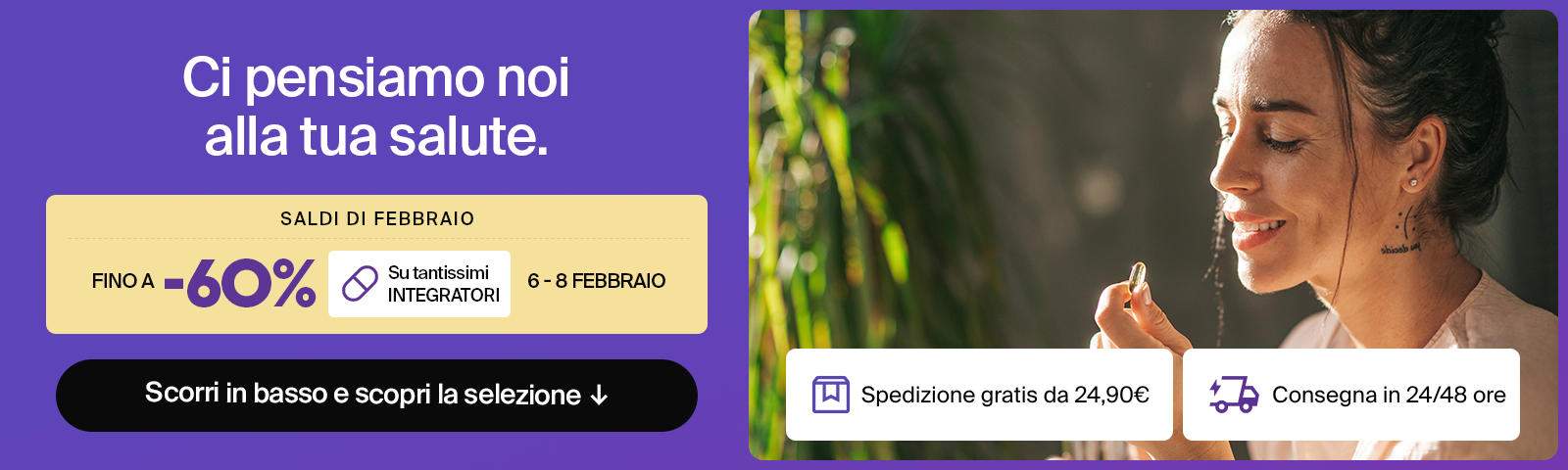 (1) Il risparmio indicato include le spese di servizio e il 7.0% di sconto sui prodotti parafarmaceutici. Lo sconto non è applicato ai prodotti appartenenti alla categoria "Medicinali" (farmaci SOP e OTC), alla categoria "Omeopatici" (prodotti omeopatici) e alla categoria "Farmaci Veterinari" (farmaci veterinari). Leggi termini e condizioni